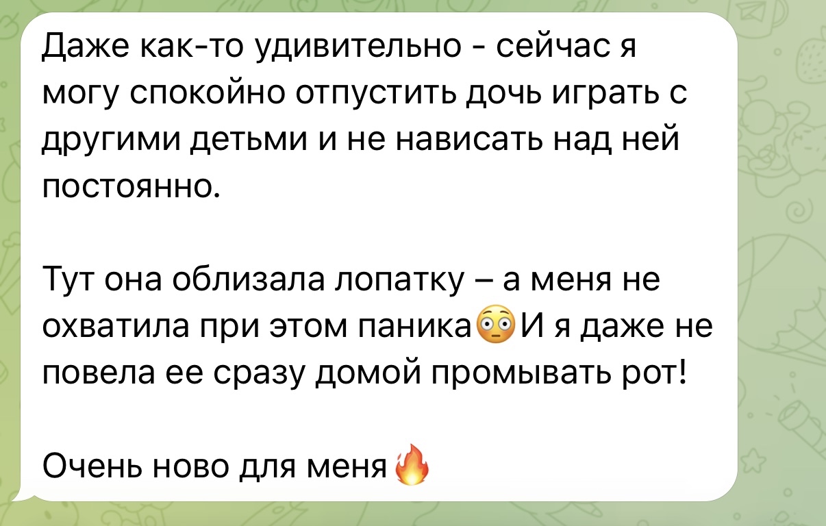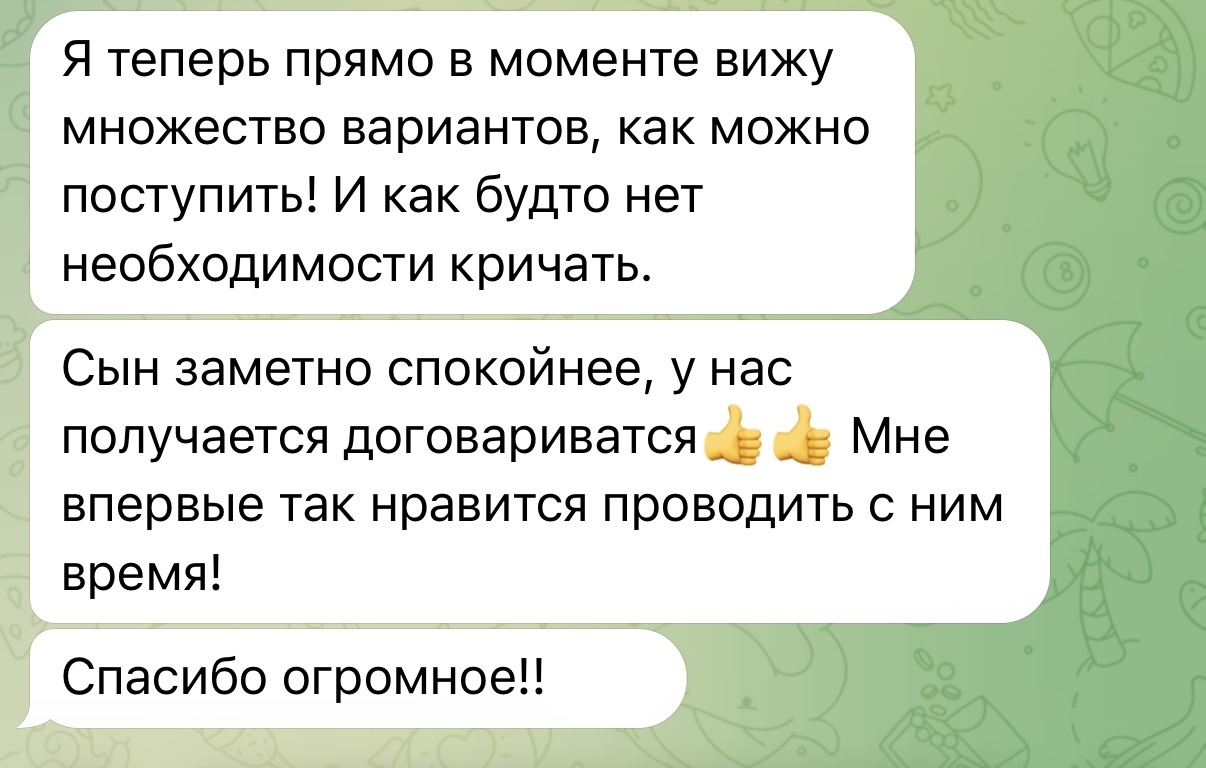По итогу всего одной сессии через пару недель она написала, что теперь совершенно по-иному проживает сложные моменты. Появилось значительно больше спокойствия и принятия.
